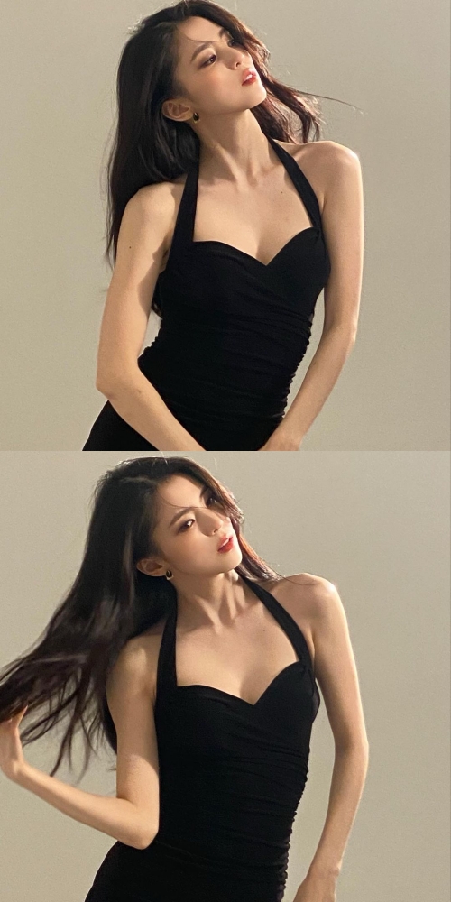 デコルテ部分が大きく開いた黒ドレスも、ハン・ソヒのシックな雰囲気を倍増させている。