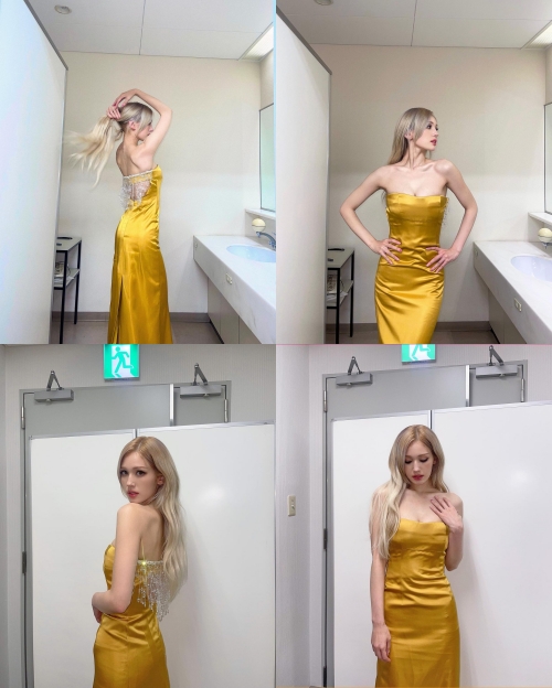 ブロンドヘアとよくマッチしたゴールドドレスからは、しなやかなボディラインがのぞく。