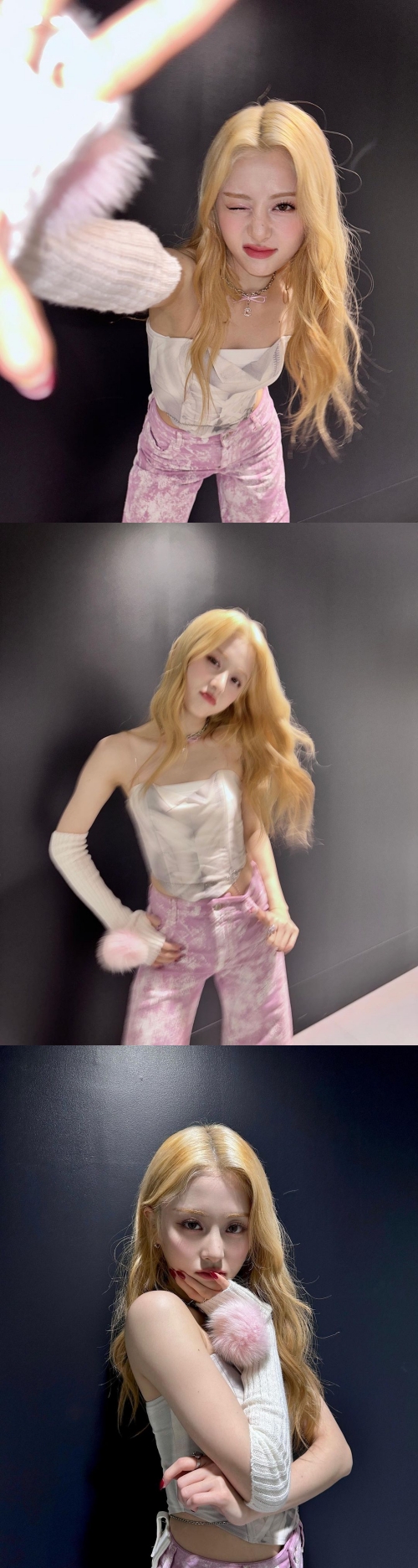 ホ・ユンジンは、白のチューブトップにピンクカラーのケミカルウォッシュデニム、毛糸のポンポンがついたアームウォーマーを着用。スタイリッシュかつラブリーなコーディネートを披露した。