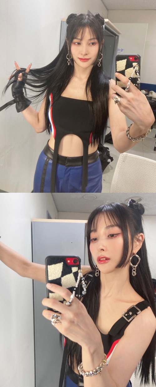 髪型はお団子ヘアをアレンジしたキュートな姿で、目元にはラインストーンが輝き、ギュリのキャットアイがより一層際立っている。