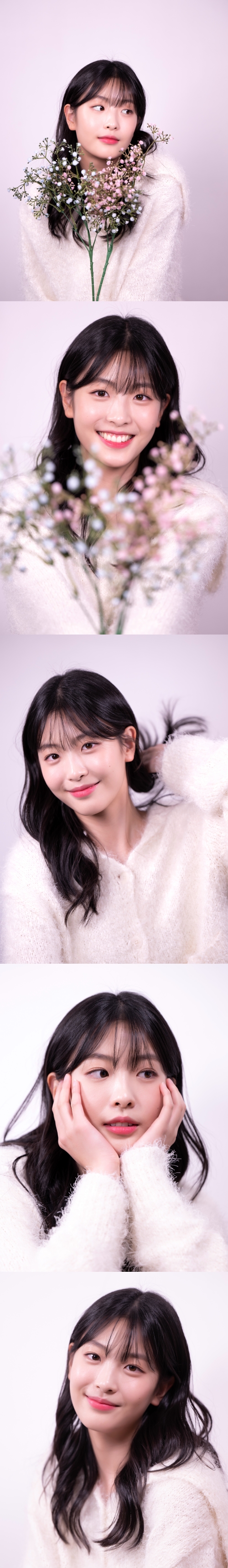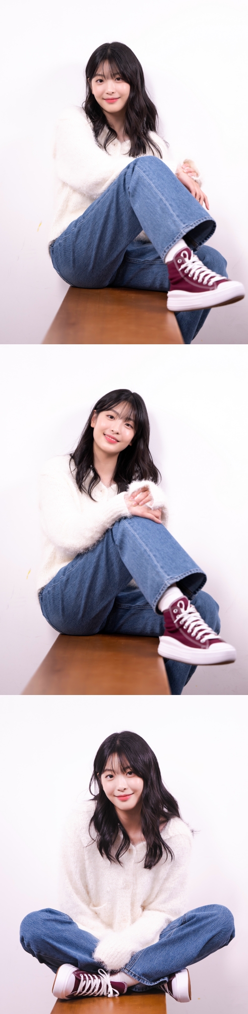 『シュルプ』で演じていた世子嬪(王の後継ぎの正妻)ユン・チョンハ役の韓服姿から一変、白ニットにデニム、スニーカーを合わせたシンプルなスタイリングで登場。オ・イェジュらしい清楚でナチュラルな美貌を発揮している。