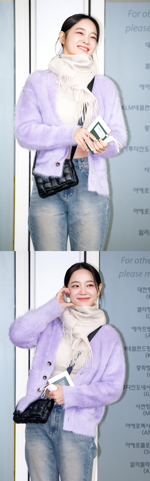 薄紫色のカーディガンにジーンズを合わせたキム・セジョン。マフラーやムートンブーツのアイテムで冬のコーディネートを完成させた。