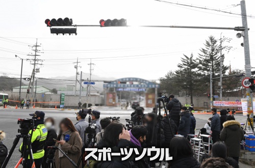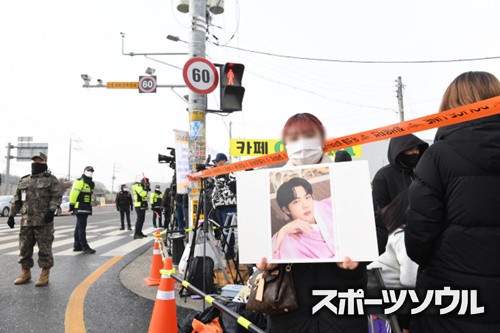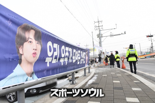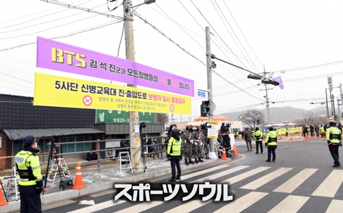 新兵教育隊に入る直前の道付近には、JINの入隊を応援するためにファンが製作した横断幕がいっぱいに並んでいた。また、国内外のさまざまなメディアの記者で賑わっていた。現場を訪れた一部のファンも、警察と軍人の案内に従って秩序を守っている様子だった。
