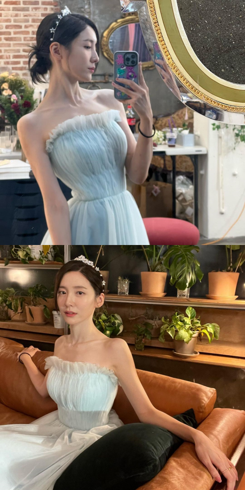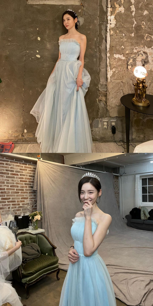 写真には、水色のチューブトップドレスを着たパク・ジヒョンが写っている。ティアラまでつけ、ディズニープリンセスのようなビジュアルはさることながら、あらわになったデコルテが感嘆を誘っている。