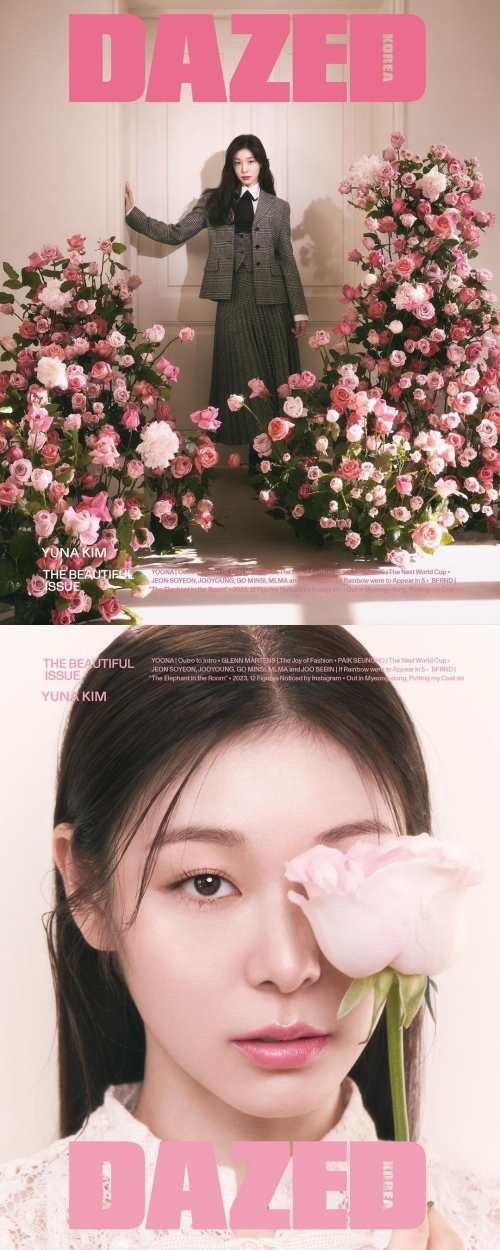 そして別カットでは、たくさんのバラに囲まれたキム・ヨナがドアの前でポーズを決めたり、バラで片目を隠したりと、清楚かつフェミニンな雰囲気をまとった。