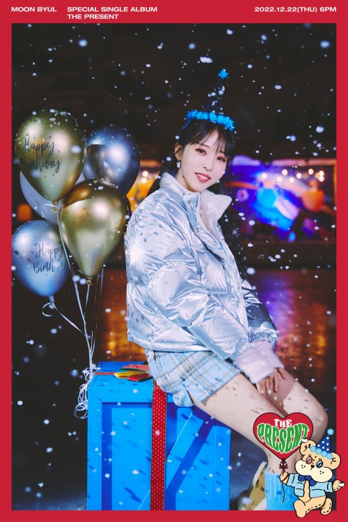 公開された写真のムンビョルは、派手な風船が飾られた大きなプレゼントボックスの上に座って明るく笑っている。メタリックなショートダウンジャケットとミニスカートを合わせ、愛らしい“ガールフレンドルック”を完成させた。