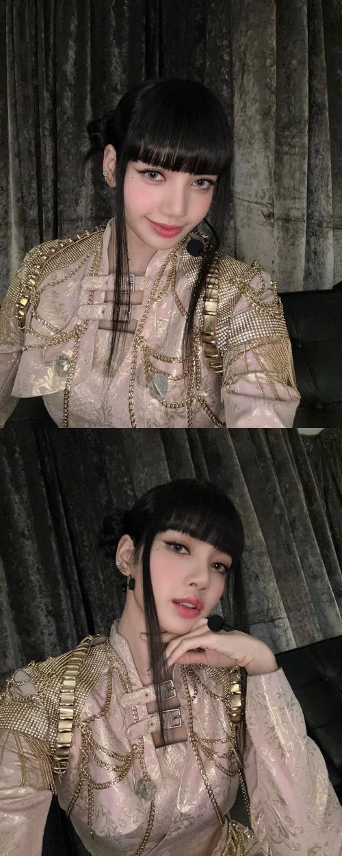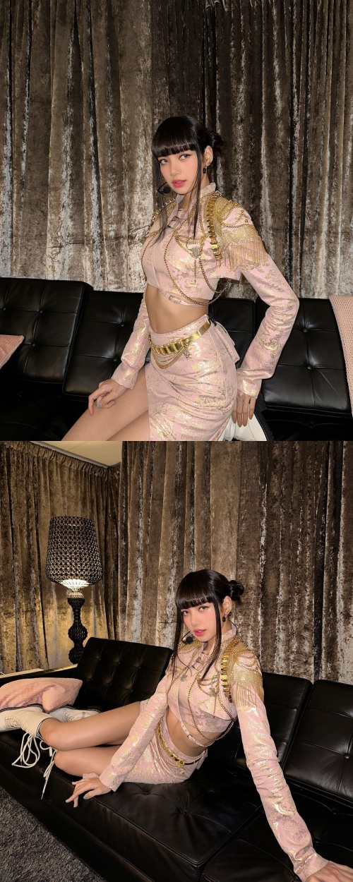 リサはサイドの前髪は長くおろした“お団子ヘア”でキュートな魅力を発揮。ゴールドの装飾が施されたセットアップ姿で、クロップドトップスからのぞくくびれたウエストからは、縦のラインがしっかりと入った腹筋が確認できる。