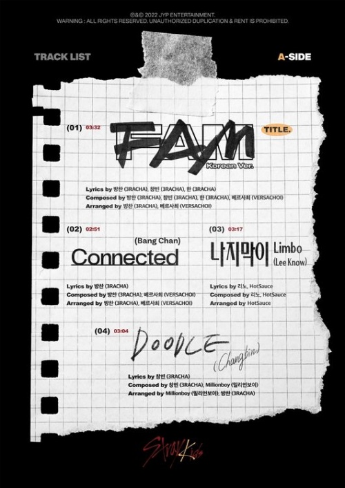 B-SIDEには『ZONE(バンチャン、チャンビン、ハン)を筆頭に、『Close(ハン)』、『Streetlight(チャンビンFeat.バンチャン)』、『認めたくない(バンチャン)』、『I GOT IT(ハン)』、『小さい星(ヒョンジン)』、『末っ子オントップ(I.N Feat. バンチャン、チャンビン))、『Alien(ハン)』、『好きだから(チャンビン、フィリックス)』、『彫刻(チャンビン、スンミン)』、『Wish You Back(ハン)』、『HaPpY(ハン)』、「今夜私は電気をつける(バンチャン、チャンビン、フィリックス、スンミン)」、『Drive(バンチャン、リノ)』、『ice.cream(ヒョンジン)』など、独自コンテンツ『SKZ-RECORD』と『SKZ-PLAYER』の中のSTAY(公式ファンクラブ)に愛された自作曲15トラックの正式音源が収録される。(A-SIDE、B-SIDEともに、日本語タイトルは原題)