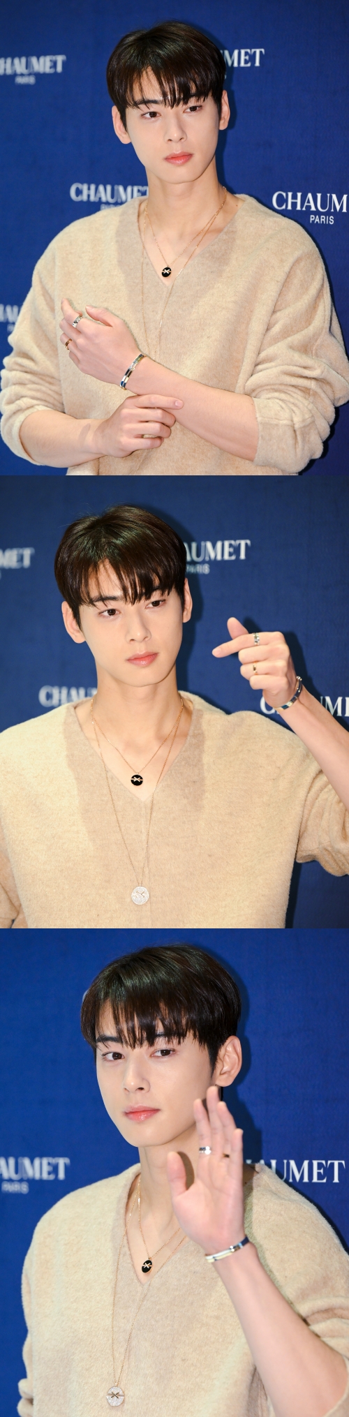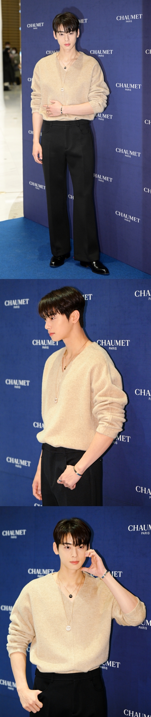 この日、チャ・ウヌはベージュカラーのニットに黒のスラックスといったシンプルな装いで登場した。Vネックからは二連になったネックレスが鎖骨の上で輝いている。
