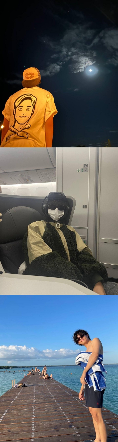 写真をのぞくと、Vが夜空を見上げる様子や、飛行機での“完全防備ショット”、ビーチに飛び込む姿など、海外旅行を満喫した様子が収められている。