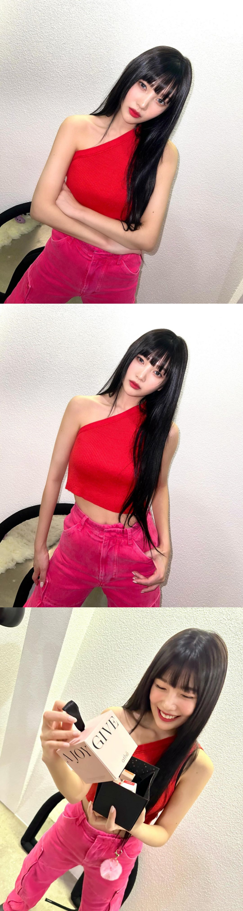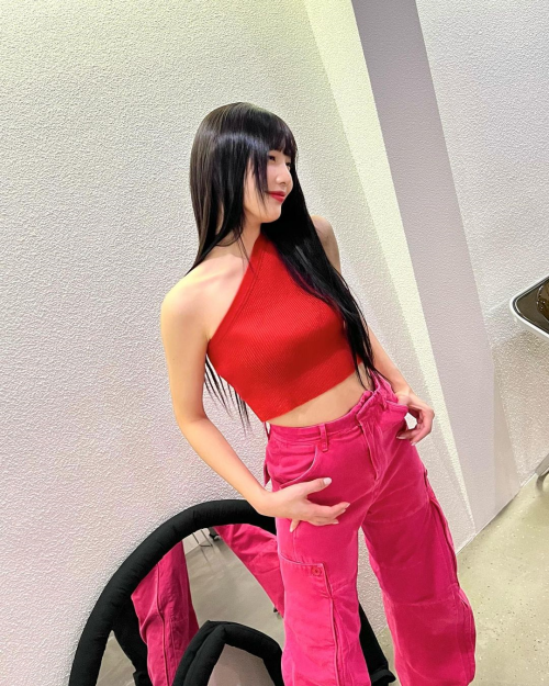 トップスからは美肩や薄いウエストがあらわになっており、赤い服がジョイの真っ白な肌を際立たせている。
