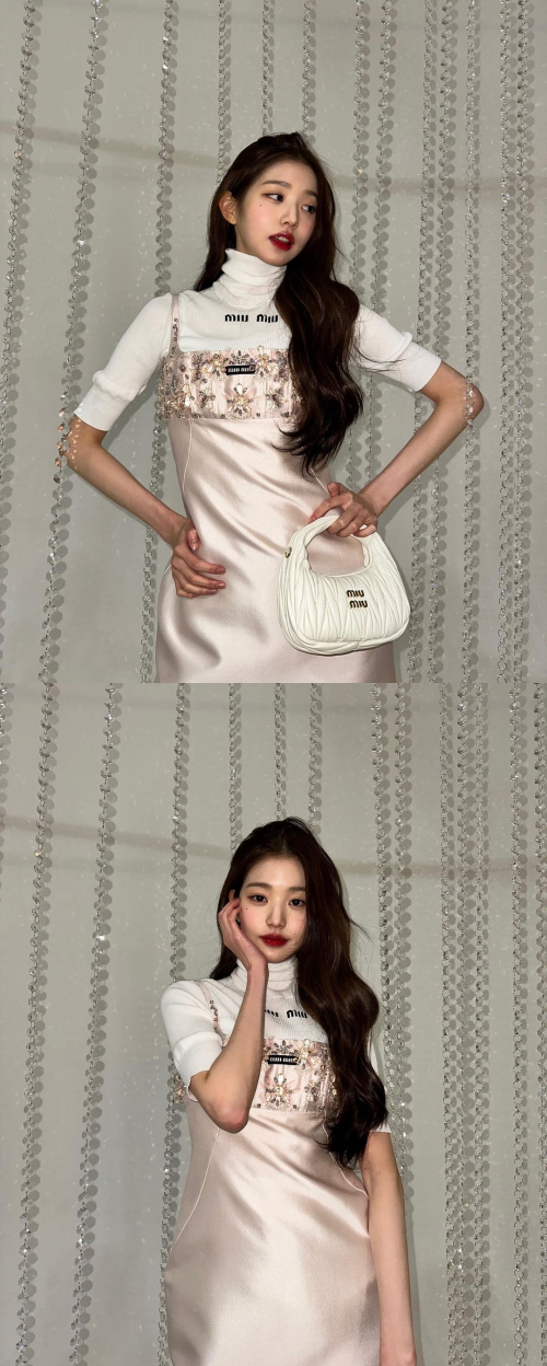 真っ白なタートルネックにサテンドレスを合わせた女性らしい服装のウォニョンは、はっきりとした目鼻立ちが際立つヘアメイクで、人形のようなビジュアルを誇示した。