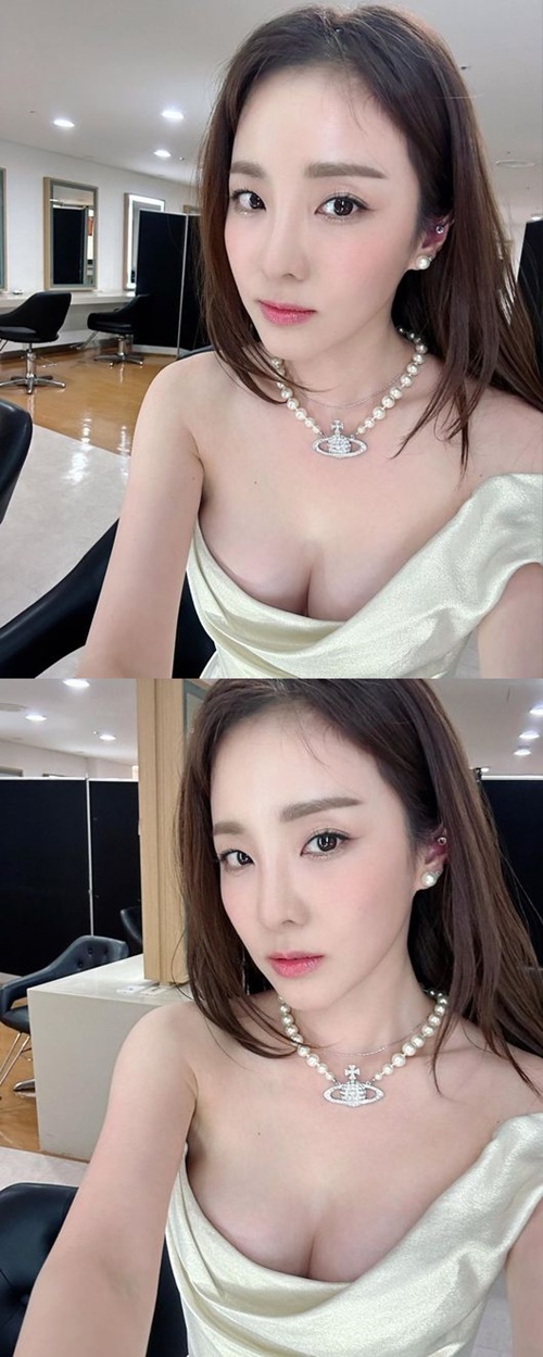 写真を見ると、白基調のオフショルダードレスを着て自撮りをするパク・サンダラの姿が写っている。