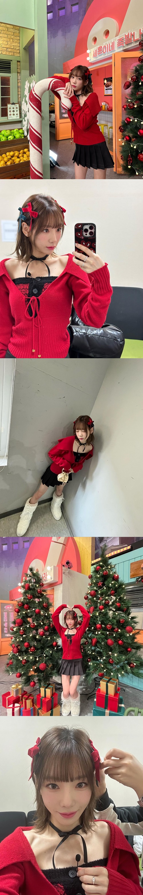 写真を見ると、クリスマスカラーのリボンを髪につけたミニスカート姿のテヨンが写っている。