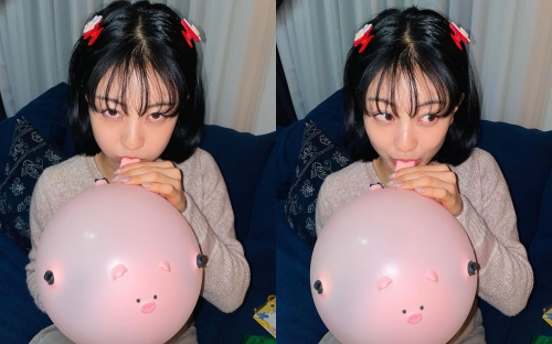 ジヒョはサイドの髪をヘアクリップで留めており、どこか幼い印象だ。風船を膨らましながら上目遣いで見つめる姿も、無邪気な雰囲気を演出している。