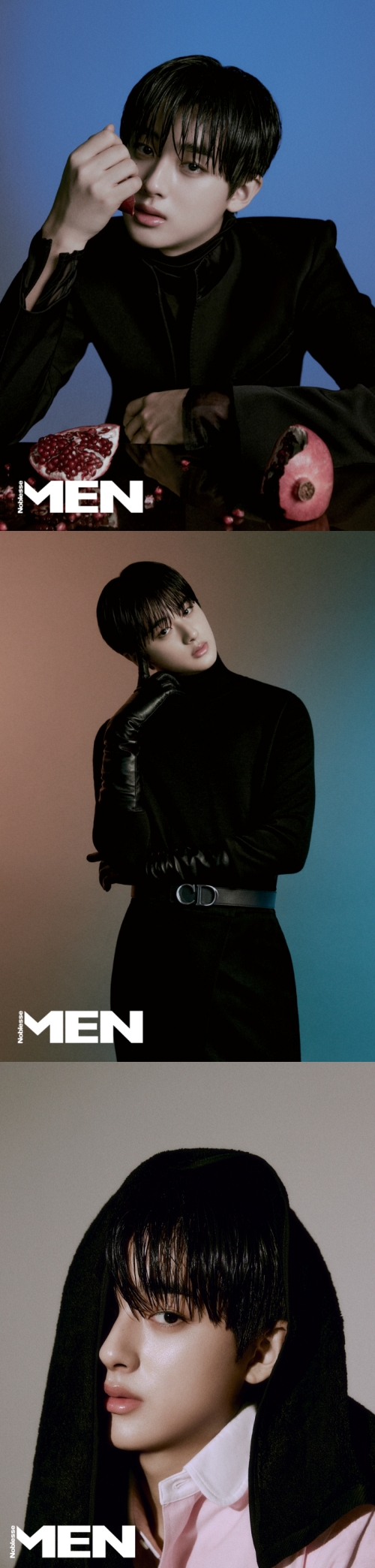 さらに、目鼻立ちのはっきりした彫刻のような顔立ちと、185cmの長身でレザーコートやシースルーシャツなどのアイテムを難なく着こなしているキム・ミンギュ。アンニュイな表情に加え、光と影が織りなす世界観がなんとも言えない幻想的なビジュアルを完成させた。
