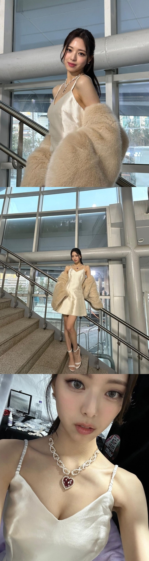 ユナは光沢感のあるアイボリーカラーのキャミソールドレスに身を包み、同系色のファーコートを羽織った。ロングヘアは後ろでまとめて清楚な雰囲気だ。