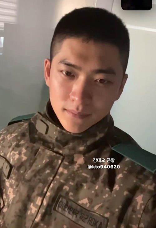 写真に写ったカン・テオは軍服を着た凛々しい姿。穏やかなイメージとは違って、気丈な印象を与えている。短い髪もよく似合っており、ファンを微笑ませた。