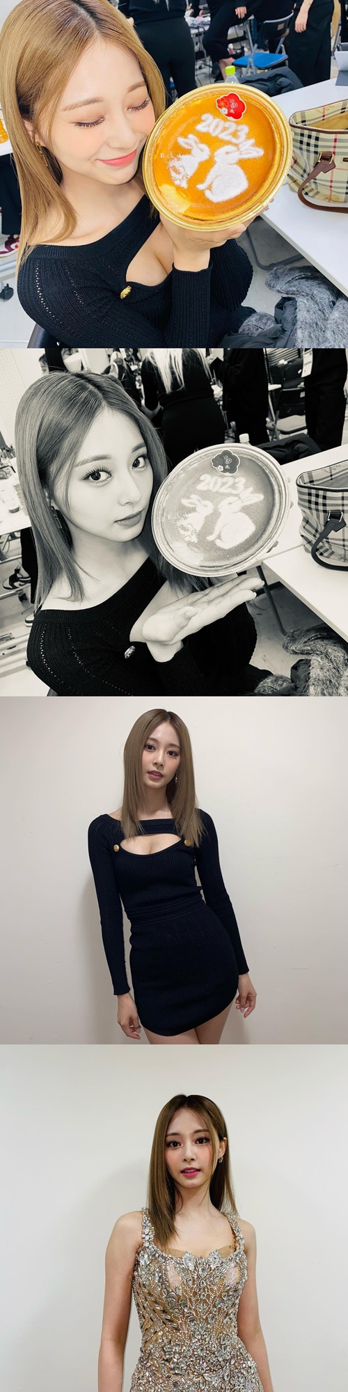 写真を見ると、楽屋と思しき場所で「2023」という数字と今年の干支であるウサギが描かれたスポンジケーキを手に、カメラにキュートな表情を見せるツウィが写っている。