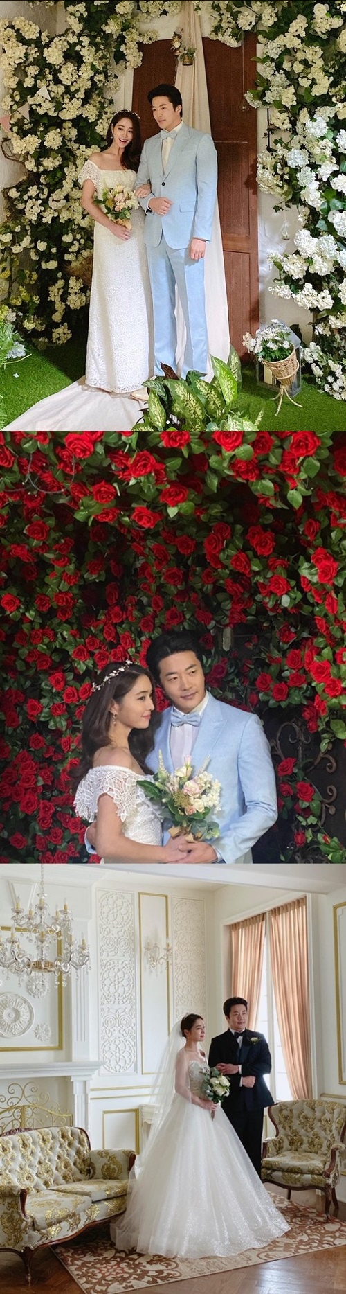 公開された写真でイ・ミンジョンはウエディングドレスを着ており、スーツ姿のクォン・サンウと仲良く腕を組んでいる。