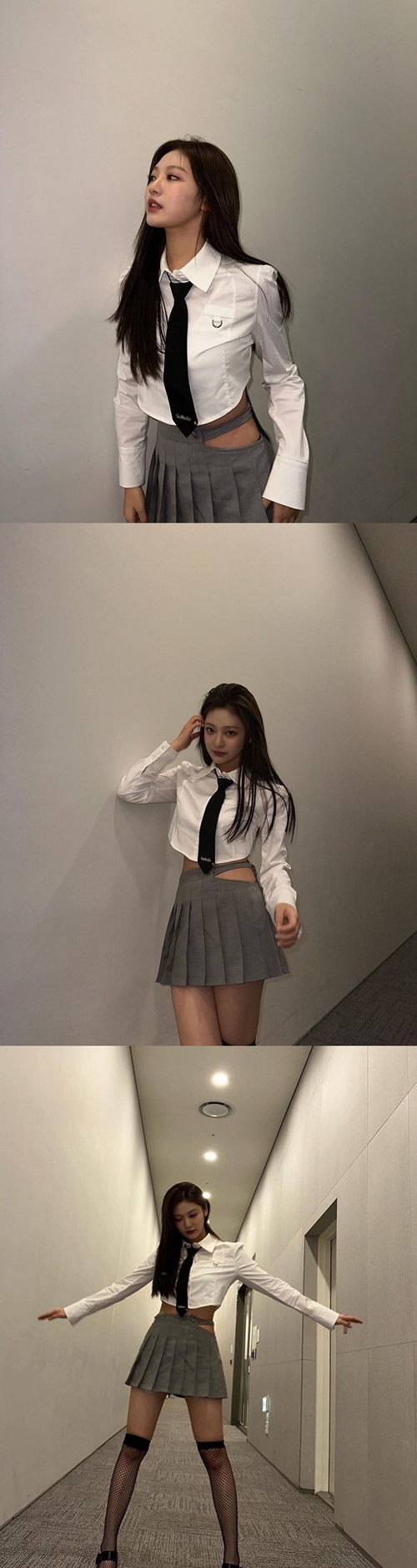 白シャツに黒いネクタイと一見K-POPアイドルのステージ衣装としてよく見られるスクールガール風コーデだが、よく見ると腰の部分が大胆にカットアウトされた衣装であることがわかる。