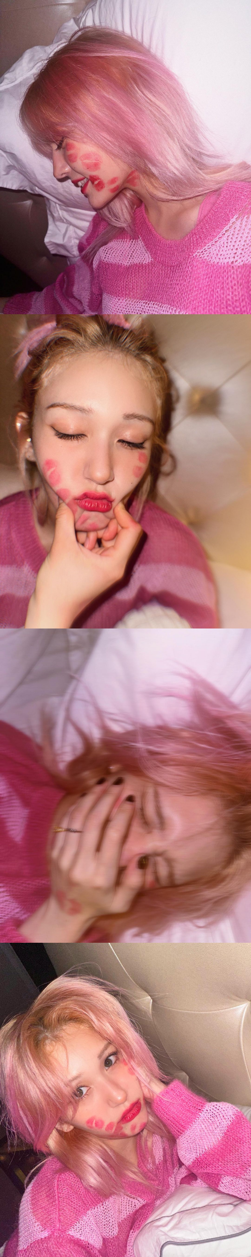 この投稿には「私がしました!」「ピンクヘア似合いすぎ」「ビジュ良くて泣ける」とコメントのほか「チェヨン?」「エブリン(チョン・ソミの妹)だね」とキスマークを残した“犯人”を推測する声も上がっている。