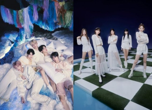 (写真=BIGHIT MUSIC、SOURCE MUSIC)TOMORROW X TOGETHER(左)とLE SSERAFIM