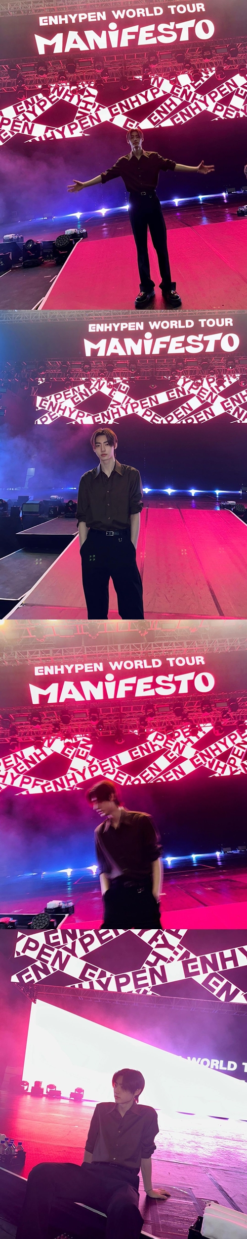 舞台の上のほうには大きな文字で「ENHYPEN WORLD TOUR MANIFESTO」と書かれており、ワールドツアー中でのオフショットであることが分かる。
