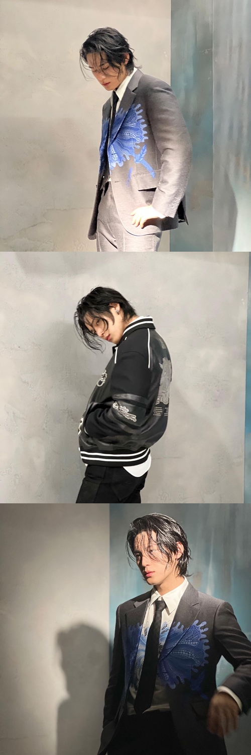 写真にはラグジュアリーブランド「ルイ・ヴィトン」とともに撮影中のミンギュの姿が。派手な柄のスーツや迷彩柄のセットアップなど、ユニークな柄も着こなしてしまう端正な顔立ちが感嘆を誘う。