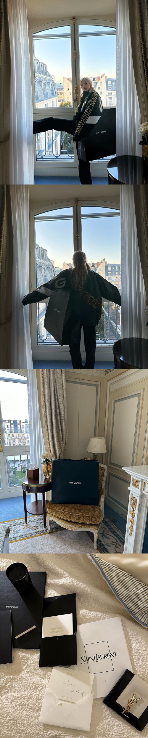 部屋には、自身がアンバサダーを務める「Saint Laurent(サンローラン)」からもらったような大きな紙袋や手紙、ブローチなどが置いてある。ロゼが持っている紙袋が上半身より大きくて、目を引く。