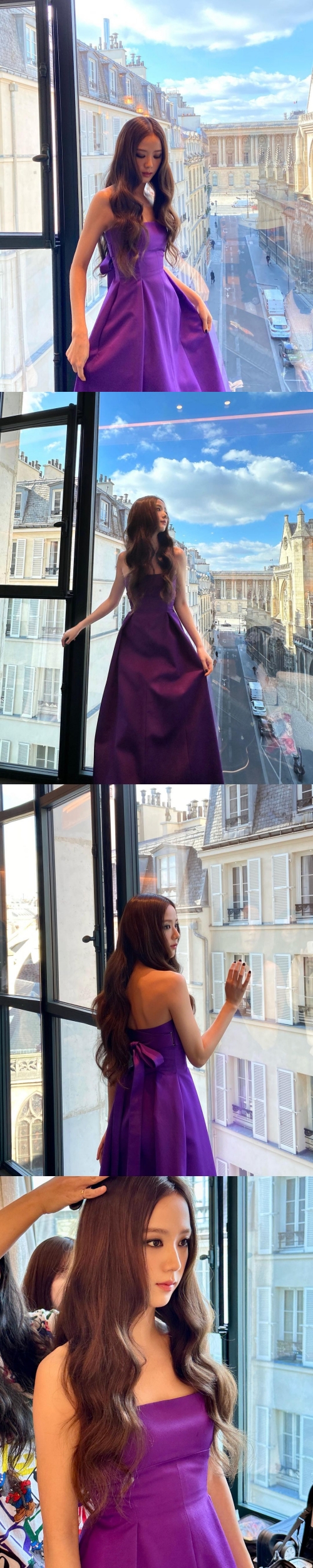 「Purple Jisoo」と綴られた写真には、パリの街並みをバックに優雅なポーズを決めるジスの姿が写っている。