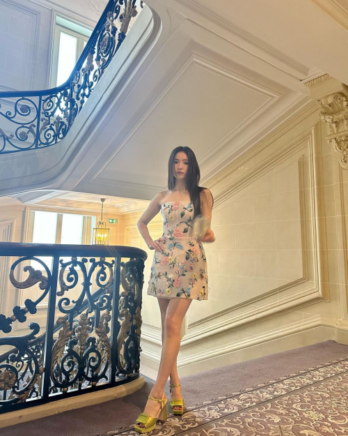写真には花柄のチューブトップミニドレスを着たシン・セギョンの姿が。美しいデコルテと真っすぐな美脚があらわになっている。