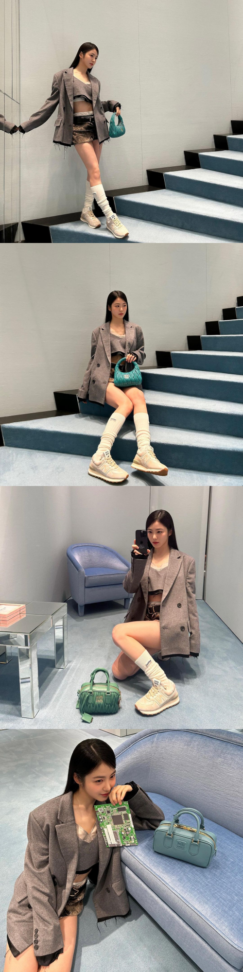 写真には、全身「MIU MIU」で着飾ったシン・イェウンの姿が。短いトップスからは薄いウエストがあらわになっており、ミニ丈のボトムスからは自慢の美脚がすらりと伸びている。