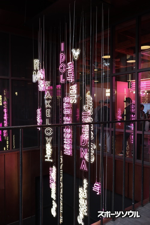 地下1階のメインショールームは、BTSの最新アルバム『MAP OF THE SOUL:PERSONA』を象徴するピンク色で彩られている。