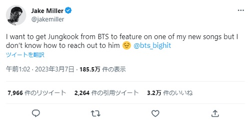 個人SNSがないJUNG KOOKに向けたジェイク・ミラーのラブコールは、3万件の「いいね!」を集め、8000件近いリツーイトがされている。