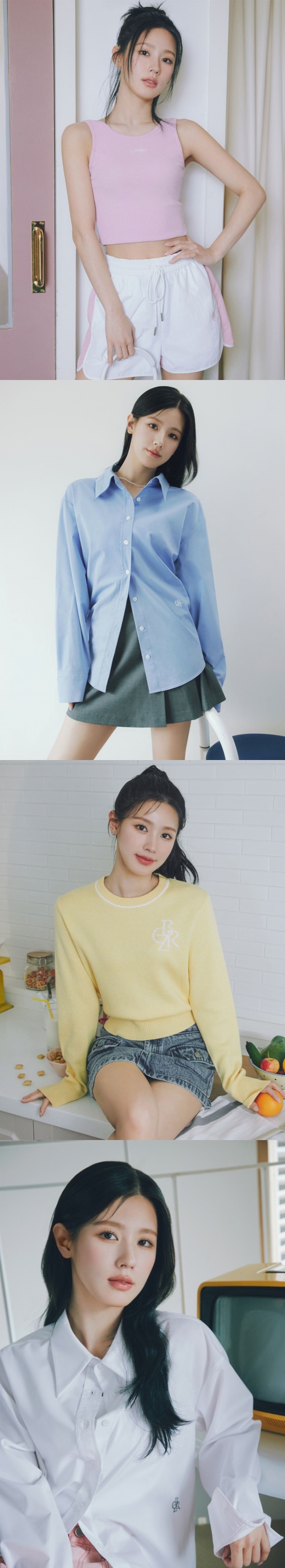 シャツとプリーツスカート、カット配色デニムパンツをマッチし、スタイリッシュなムードを醸し出したかと思えば、華やかな色合いのニットを着用し、春の爽やかな雰囲気を発散した。