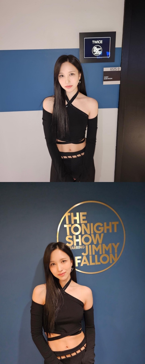 “全身黒”の衣装でシックにまとめたミナは、クロップドトップスで華奢な鎖骨と縦に線の入った腹筋を披露した。