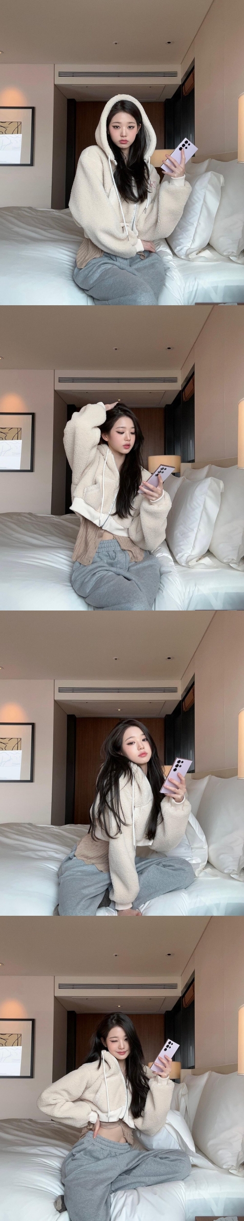 ウォニョンは、ボアパーカーにジョガーパンツを合わせたリラックスモードのスタイリング。クロップド丈のパーカーから縦線の入ったお腹をのぞかせて、ファンをときめかせた。