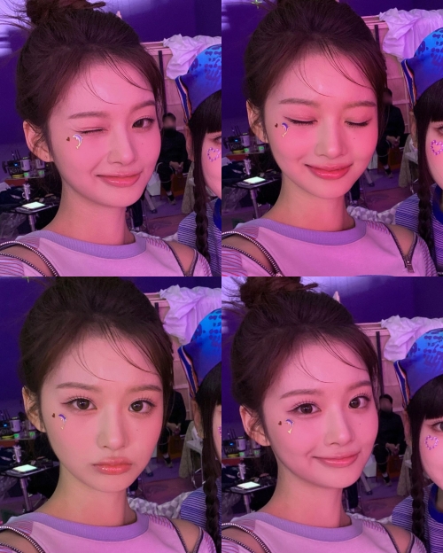 目元にはステッカーが輝くキュートなメイク。ショルダーカットトップスで華奢な肩をのぞかせている。