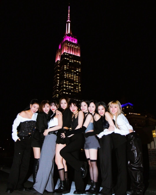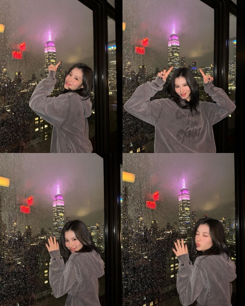 サナの指先にはニューヨークのランドマークであるエンパイア・ステート・ビルがある。これは、TWICEがミニアルバム『READY TO BE』をリリースしたことを受け、エンパイア・ステート・ビルがTWICEの公式カラーであるピンクにライトアップされた様子だ。