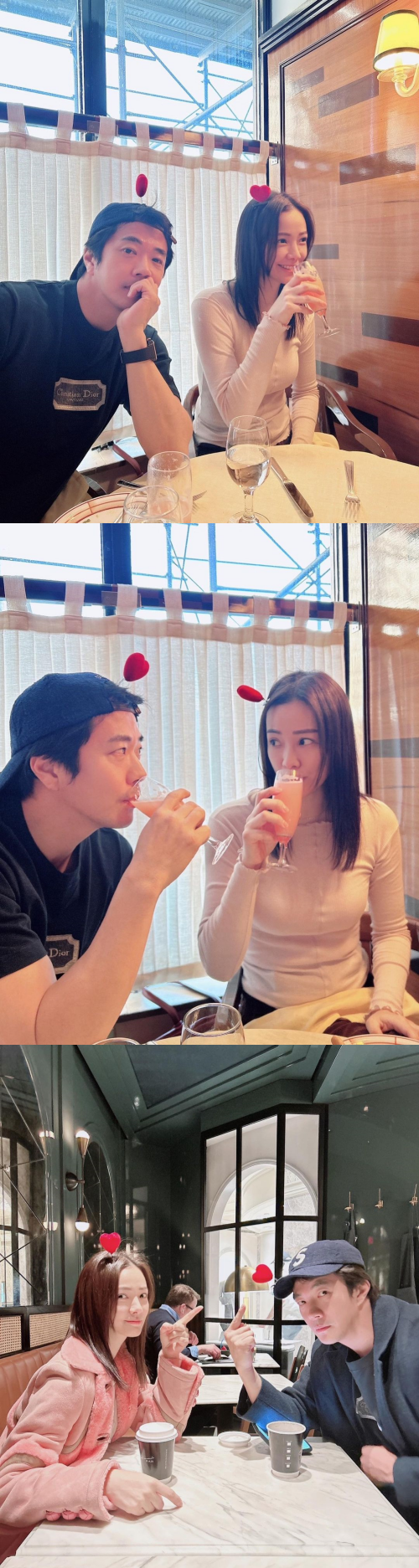 カフェでホワイトデーを楽しんでいるようだ。2人は頭にハートがついたカチューシャをつけ、可愛らしい姿を見せた。見つめ合ったり、不意打ちに妻の写真を撮ったり。