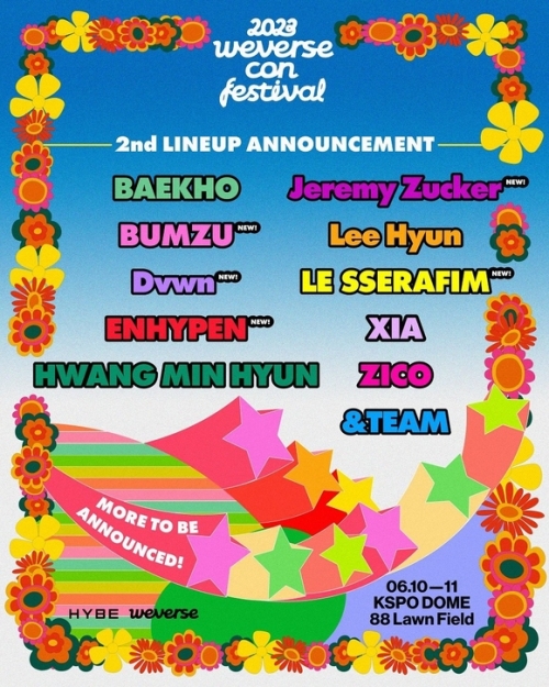 HYBEは、6月10日・11日の2日間、韓国ソウルのオリンピック公園 KSPO DOME(体操競技場)と88芝生広場で開催される2023「Weverse Con Festival」の第2弾出演アーティストラインナップを発表した。