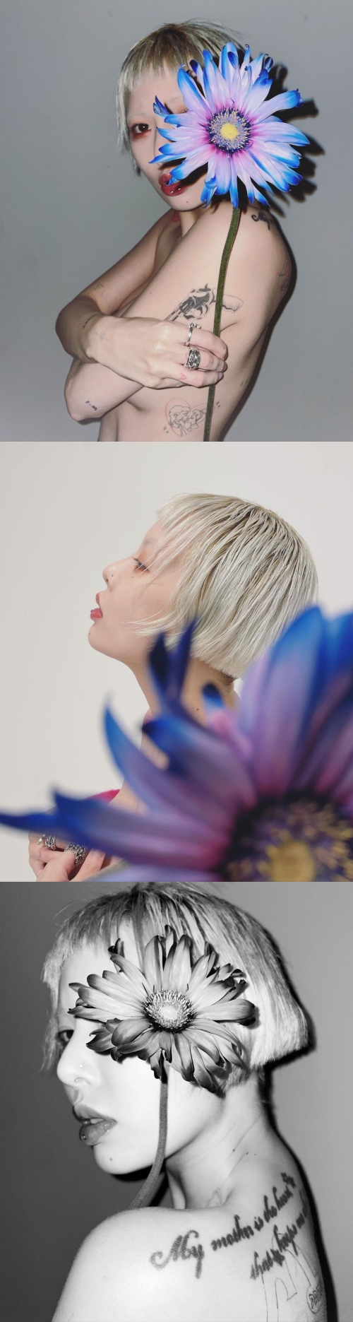 写真の中のヒョナは、大きな花を持ったままさまざまなポーズを取っている。