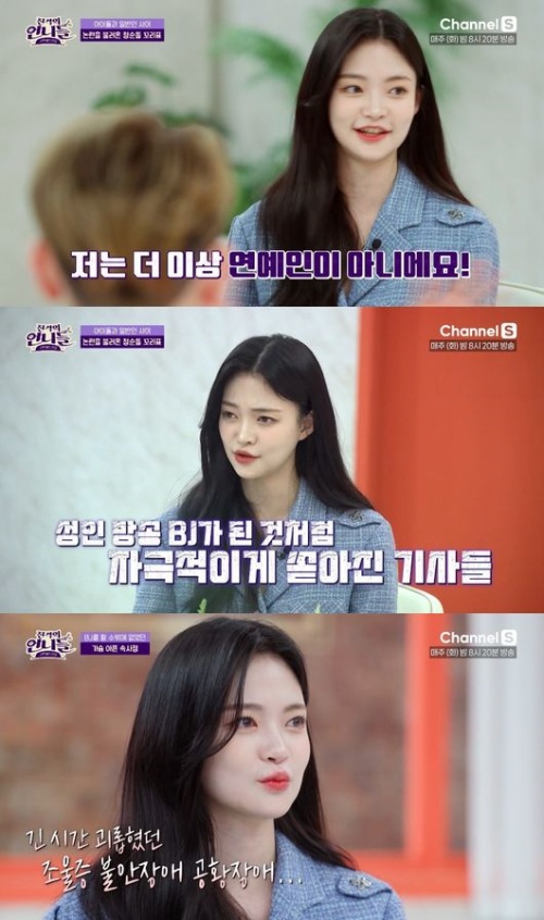3月28日に放送されたチャンネルS『進撃のお姉さんたち-悩みカットサロン』(原題)には、DIA出身のBJ(ブロードキャスティングジョッキー:顔出しで動画配信する人)アン・ソミが登場。アン・ソミは「BJとして1年間活動しているが、アイドル出身という理由で多くの非難を受けている」と話し始めた。