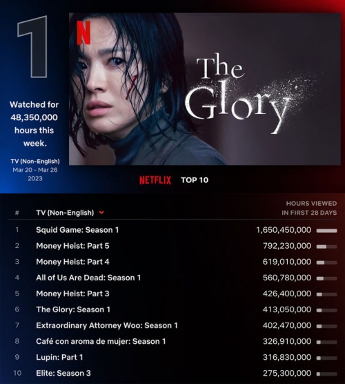 『ザ・グローリー』が4億1305万時間累積視聴を記録し、Netflix TV(非英語)部門歴代視聴時間6位となった。韓国のNetflixシリーズのなかでは『イカゲーム』、『今、私たちの学校は…』に続く驚くべき成果だ。