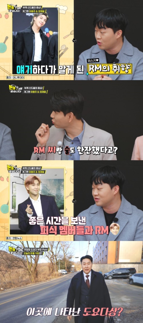この日の放送には、コメディアンのイ・ヨンジュ、チョン・ジェヒョンがゲストとして登場する。YouTubeチャンネル「Psick Univ」でも有名な彼らは、RMの家で飲み会をしたと打ち明ける。