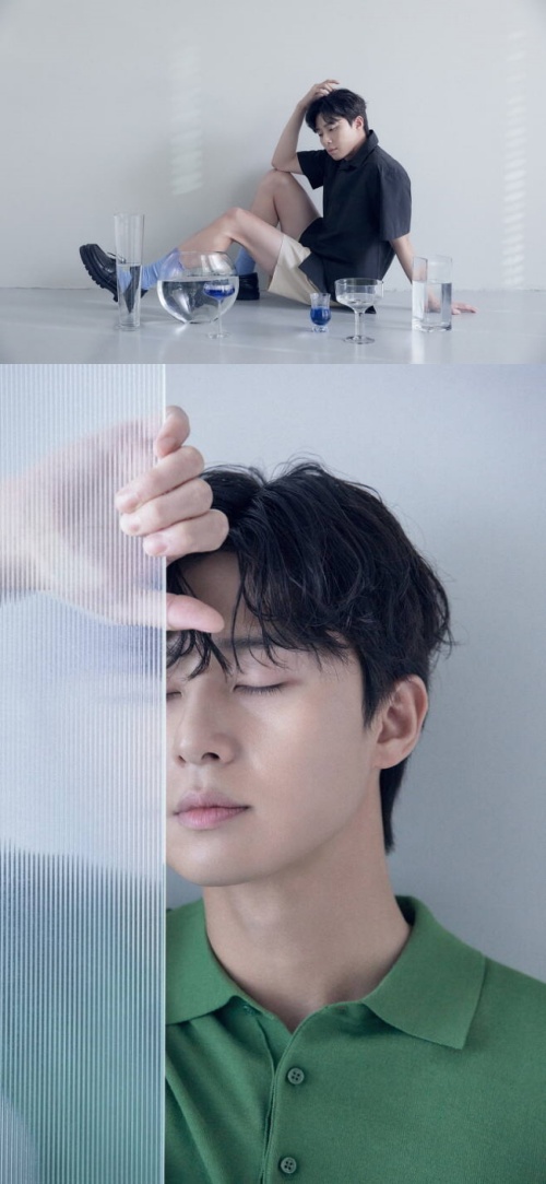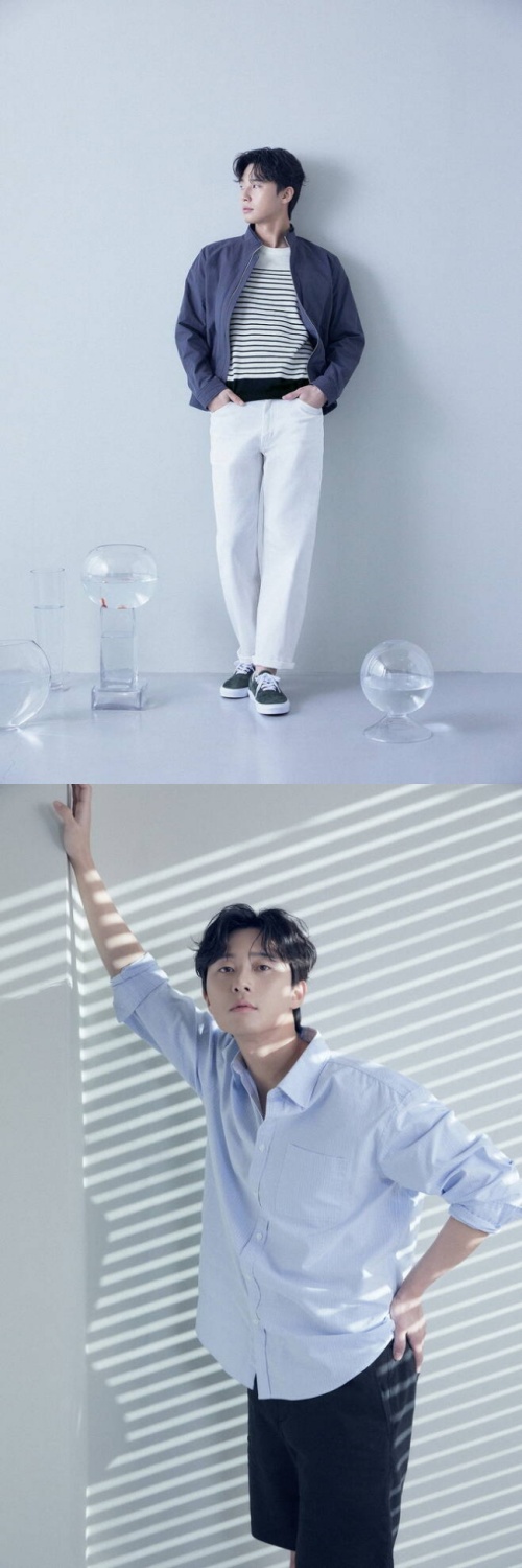 写真のパク・ソジュンはホワイトデニムとストライプTシャツにネイビーカラーのジャンパーでカジュアルな魅力を発散し、襟付きの半袖シャツやYシャツで清涼なイメージを与え、男性美あふれる夏ファッションを完成させた。