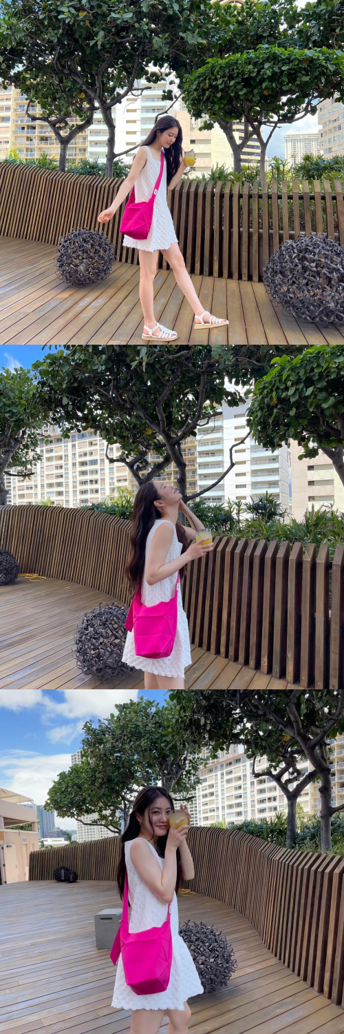 写真には、真っ白なワンピースにショッキングピンクのバックを合わせた真夏の格好でワイキキを満喫するシン・イェウンの姿が。ぺたんこのサンダルを履いているにもかかわらず、ミニ丈のワンピースから伸びる美脚が目を引く。