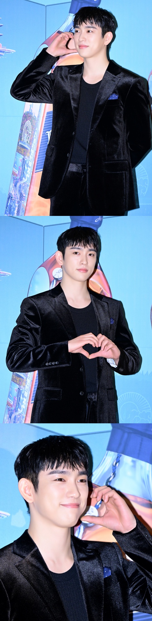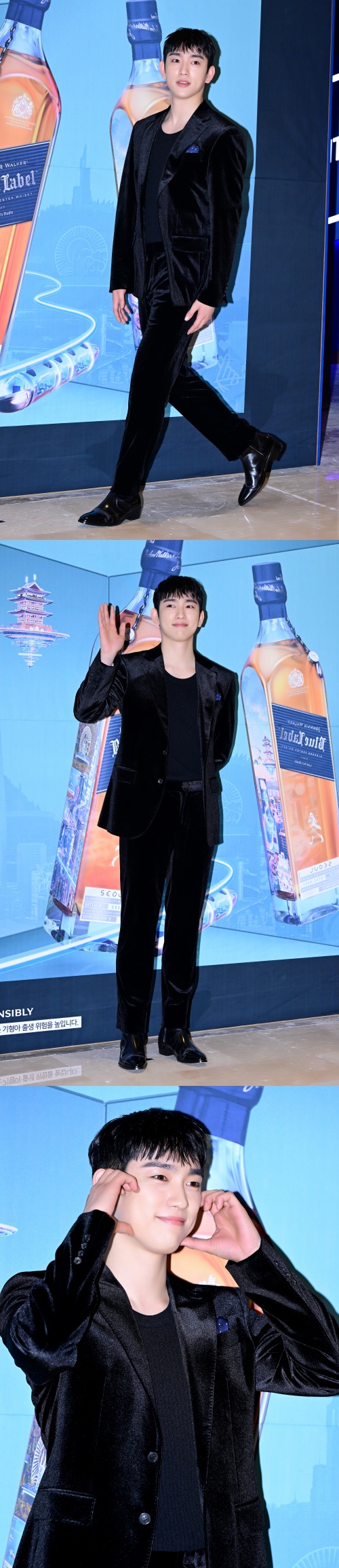 ベルベット素材のブラックスーツを着て、颯爽と登場したジニョン。シックな雰囲気を醸しながらも、“頬ハート”をしたり、手を振ったり、愛らしい姿でファンやメディア関係者をときめかせた。