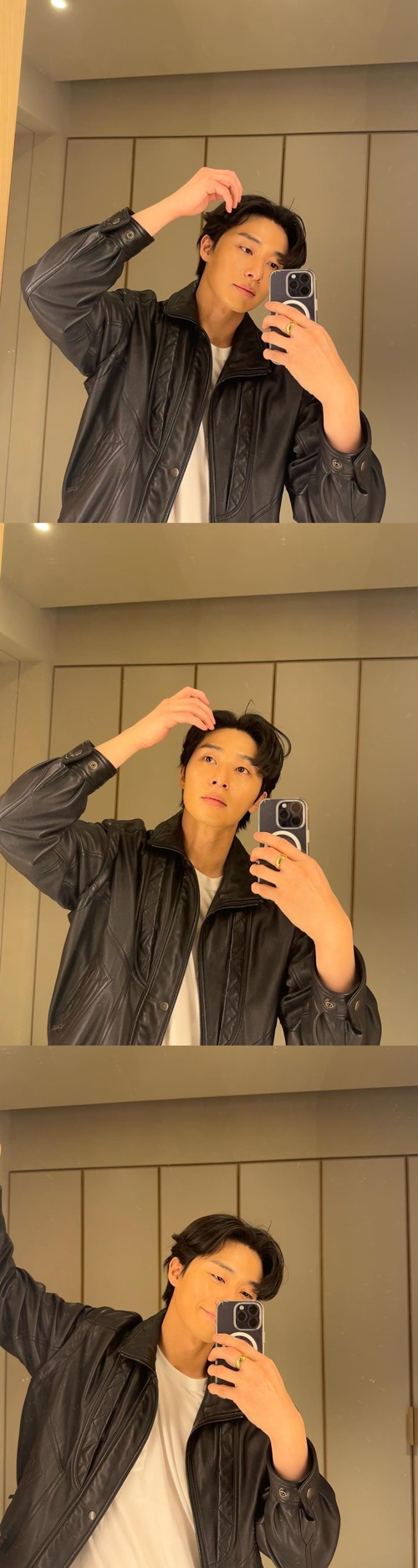 パク・ソジュンは4月13日、自身のSNSに黒いレザージャケット姿の鏡自撮り写真を投稿した。ヘアスタイルを手直しするかのような仕草がかわいらしい。